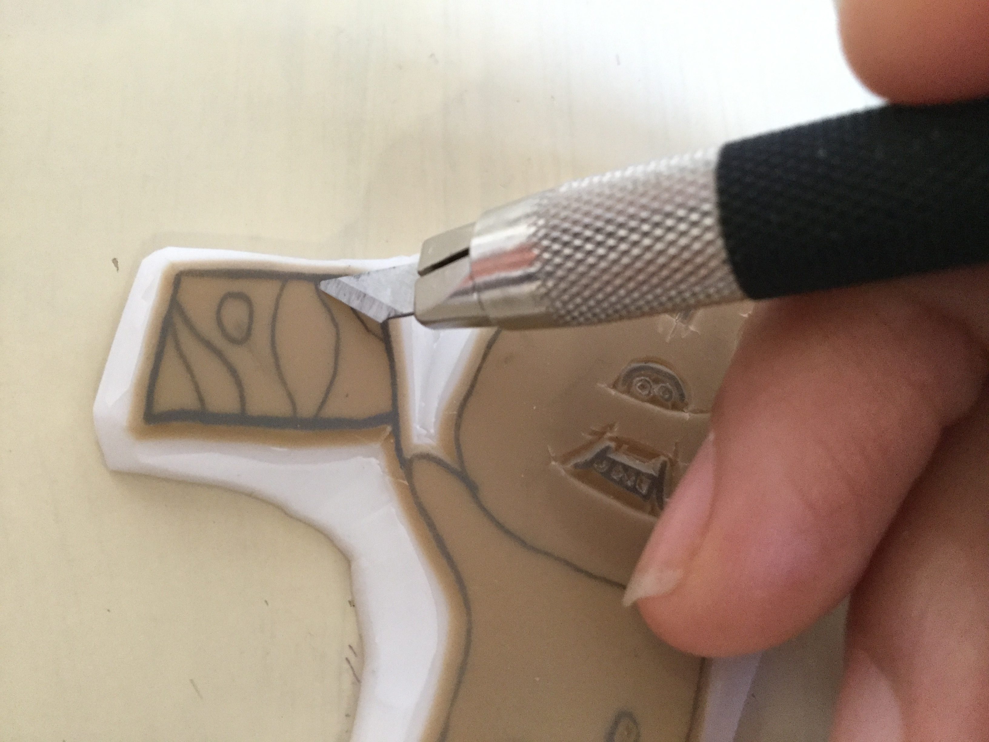 それから各パーツを彫っていきます。これも線と線が接近しているので、刃は浅めに彫っていきましょう。