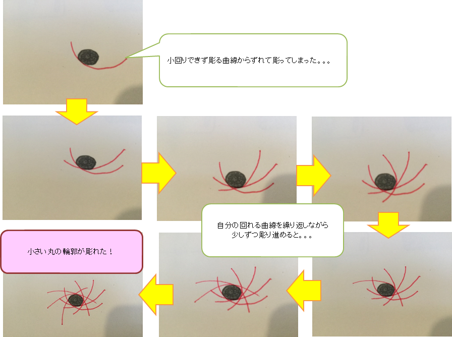 この絵はちょっと大げさですが、うまく消しゴムを動かせずに、刃の向きがうまくできずに大回りになってしまうならば、一筆書きができるまでは何度も回りながら沿っていきながら小さく回るコツをつかんでいけばいいと思います。
